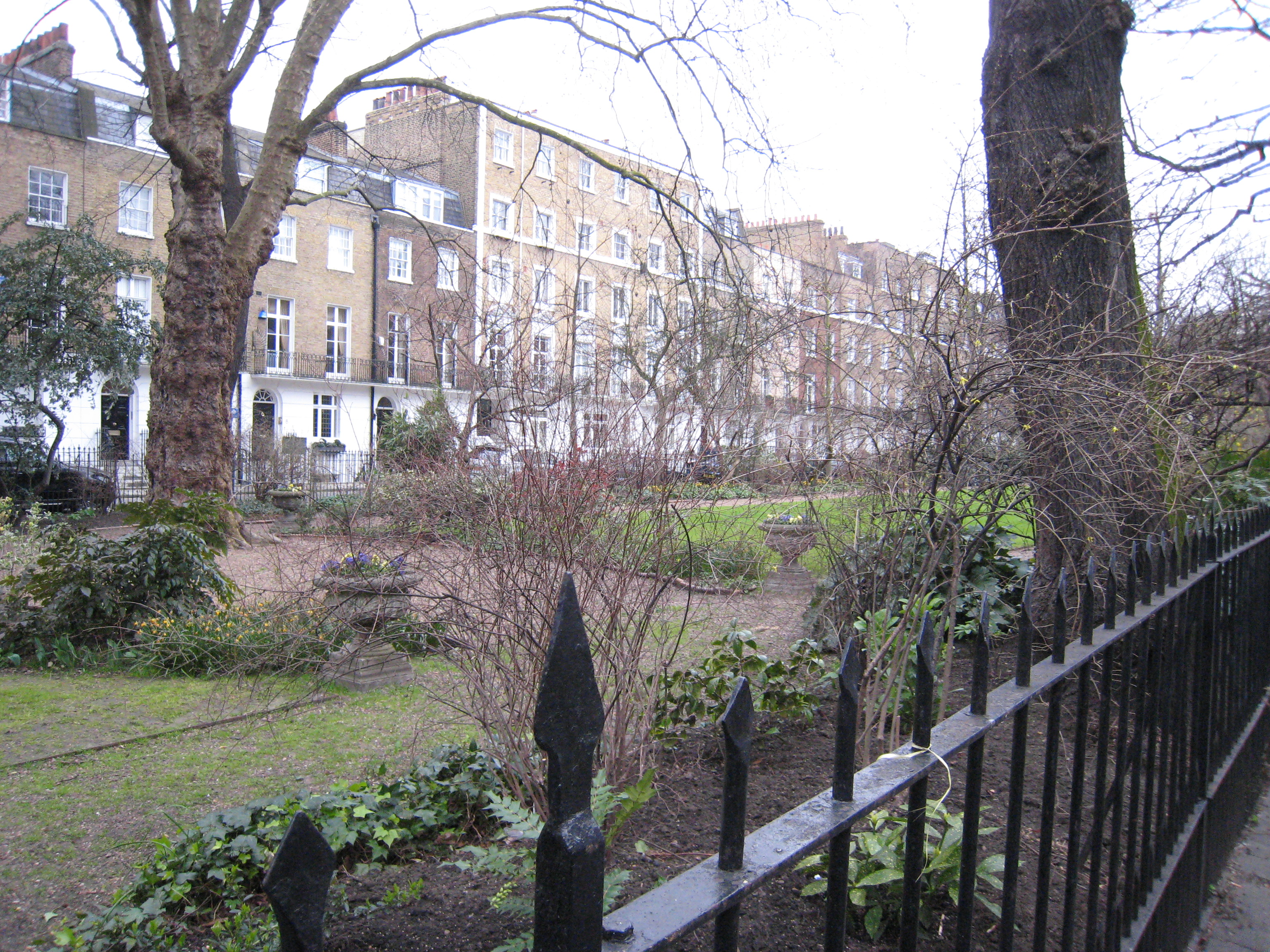 This rather severe square is actually a long rectangle with one rounded end and a gateway leading over to Ennismore Gardens. Brompton Square is immediately off busy Brompton Road which runs in front of Harrods. It is a very long square – too long from a permeability standpoint. But the width is very pleasant looking across the green., and the most successful dimension of the entire project. The overall ensemble is disrupted by later vertical additions of two additional stories, and the long stretch of modest housing is unbroken in terms of the architectural treatment. There is no real modulation to break the severe horizontality.