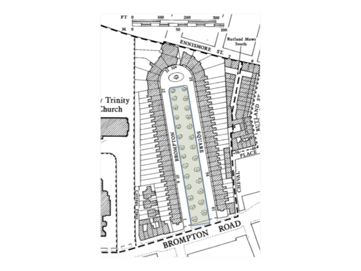 The land encompassing Brompton Square totaled 5 acres and had been earlier tenanted as a garden in the late 1700s. James Bonnin started building at the Brompton Road side in 1821 on a 99 year leasehold held by Ms. Mary Tatham Browne. Farlar soon purchased the whole freehold, granting many 97 years leases for the remaining houses. The crescent shaped terminus was constructed last.