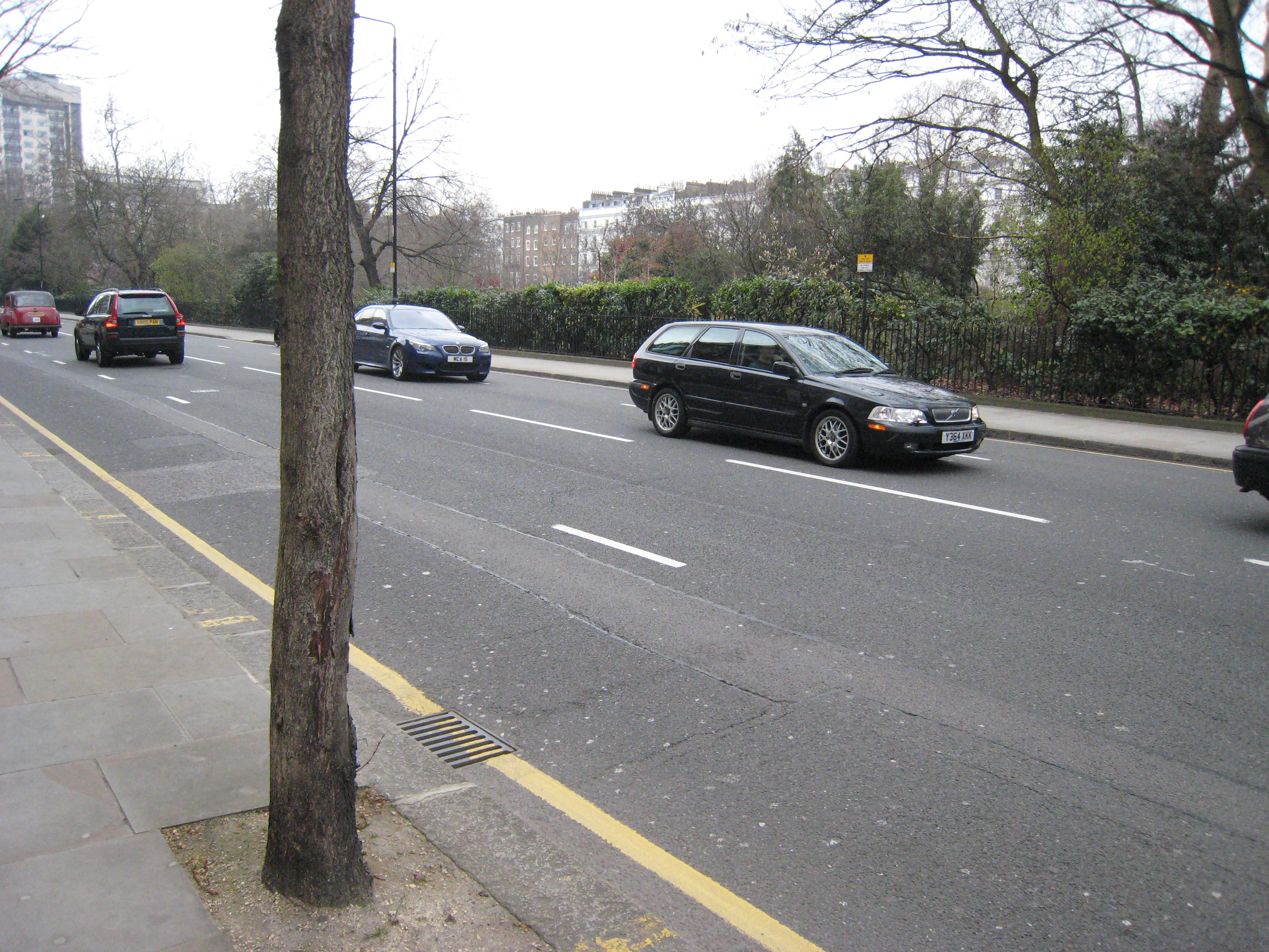 The fault here is one of scale. Most of the original fabric was four stories and though the height-width closure ratio was modest at that scale (around 1:5 across the width), the scale was intimate. This is true along most of the east side where the narrow street (26 feet wide) is graced with a fine 7 foot wide sidewalk. Sloane Street, the most important north-south street in the district, is 39 feet wide, and both the width of the street and the high volume of traffic effectively cut the western buildings from any practical connection with the park.