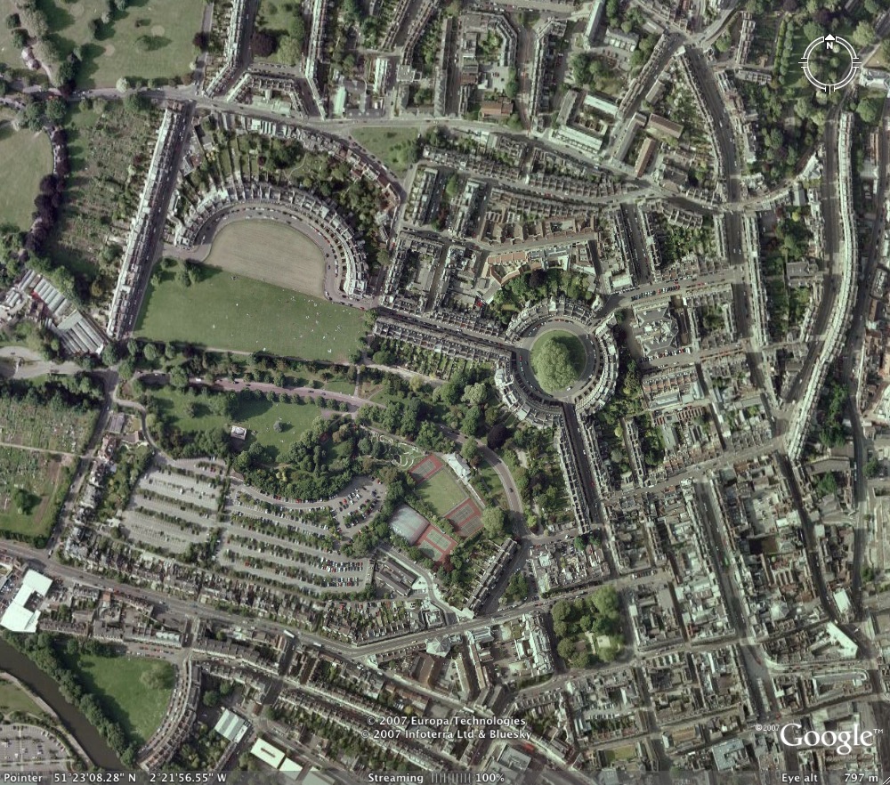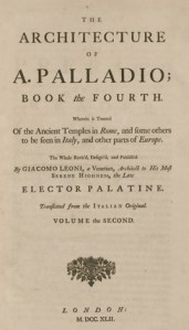 Next, Colen Cambell published the first volume of Vitruvius Brittanicus in 1716; Leoni published the a printed version of Palladio’s Four Books on Architecture in 1716 and followed with Alberti in 1726. Elizabethan ways were being left behind, and Neoclassicism was substantially underway in the English isle. Two years after the Alberti publication, John Wood began Queen’s Square in Bath. Woods’s composition was well scaled (approximately 295 feet (90 m) square from face of building to face of building) and England’s first architecturally unified residential square. It was followed by another unified circular “square” (the Circus) in 1754 and John Wood’s Jr.’s Royal Crescent in 1767. These three assemblages at Bath had an enormous influence on the history of square design in London as well as Edinburgh during the ensuing years.