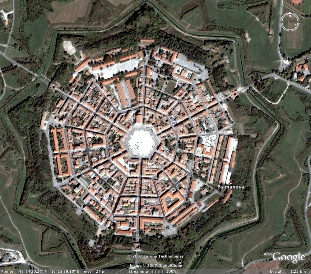 It was not until the early Renaissance that Vitruvius’ writings came back to the foreground, and town planning concepts of the ideal village or town were reawakened. Fortress towns such as Palma Nouva were created in idealized patterns, organized around carefully planned central and subsidiary squares. Much of Palma Nova today reflects the original Renaissance design. Palma Nova’s subsidiary squares are approximately 800 feet apart as the crow flies – not far from an idealized spacing, a subject to which we will return.