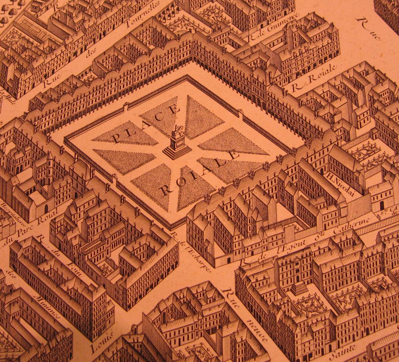 The impact of Italian Renaissance urban designs in Italy made a significant impact in Paris soon thereafter. From the standpoint of urban design, the French King Henri IV’s real estate speculation in the Marais quarter set the stage. The Place de Henri Quatre (the Place Royal as the King referred to it or the Place des Vosges as it is known today). This “Place” was the first formal predominantly residential square in Paris – literally bursting through the incommodious fabric of medieval Paris in 1606. It was an extraordinary departure from the organic and irregular form of the Marais quarter.